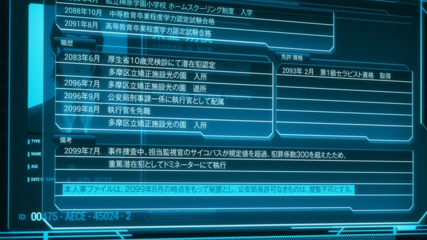 実は東金さん、過去に執行官として働いていた時期があったらしい。その際、周囲の人間の犯罪係数を軒並み300オーバーにしてエリミネーターで処分。その後、免職…。